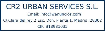 Te damos la bienvenida al portal www.wanuncios.com (en adelante, el “Portal”). Los productos y los servicios de WANUNCIOS (en adelante, los “Servicios”) se proporcionan a través de CR2 URBAN SERVICES S.L. (en adelante, «WANUNCIOS»), con el que puede contactar rápidamente a través de este formulario de contacto, Email de contacto info{arroba}wanuncios.com y nuestra dirección en Calle Clara del rey 2 Esc. Dch, Planta 1, Madrid, 28002 y con Número de Identificación Fiscal B13931035.